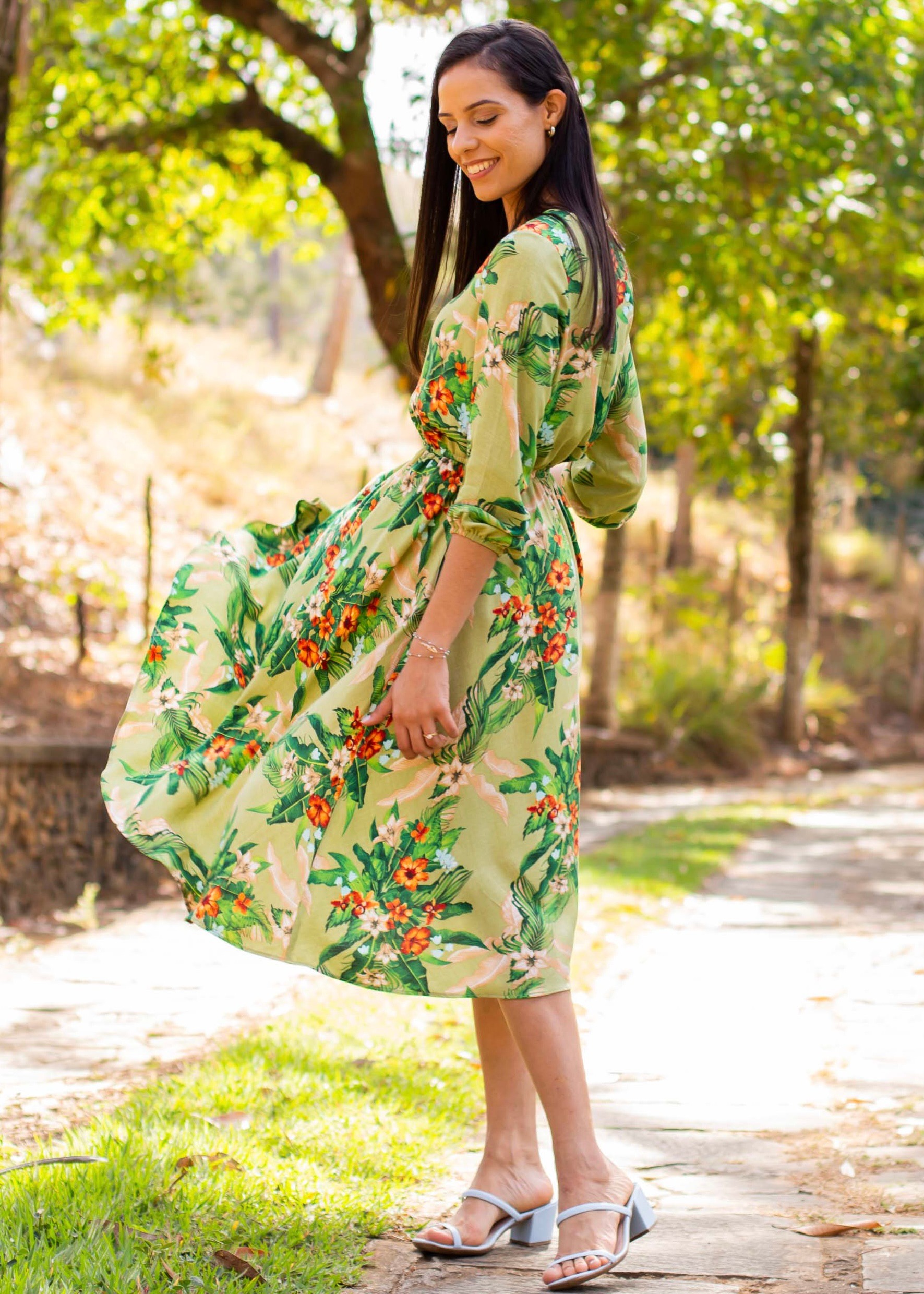 VESTIDO FLORAL MARI confeccionado em tecido viscose com texturinha muito conhecida como a "seda artificial" devido ao toque macio no corpo. Possui um caimento leve e esvoaçante que traz beleza e conforto para quem veste. Possui elástico estreito na cintura e punho. O decote tem formato de V, mangas em comprimento 3/4, corpinho todo forrado, bolsos nas duas laterais. O recorte da saia é em modelagem meio godê. Caimento fluido, tecido leve e com textura de seda, não marca no corpo. A estampa floral deixa a composição de seu look mais feminina e delicada, ainda mais quando se trata de uma estampa harmoniosa como esta! O vestido midi une estilo e conforto. É uma peça versátil, que imprime elegância e feminilidade. O vestido é uma peça prática e que valoriza o corpo se coordenada com acessórios adequados para cada ocasião.